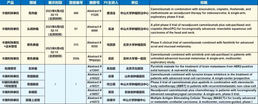 此外,在头颈肿瘤、黑色素瘤、骨肉瘤、鼻咽癌、肾细胞癌、尿路上皮癌等多个领域,卡瑞利珠单抗、吡咯替尼等产品相关研究一共入选了4项壁报展示和5项线上发表,彰显了PA视讯医药强大的自主研发综合实力。