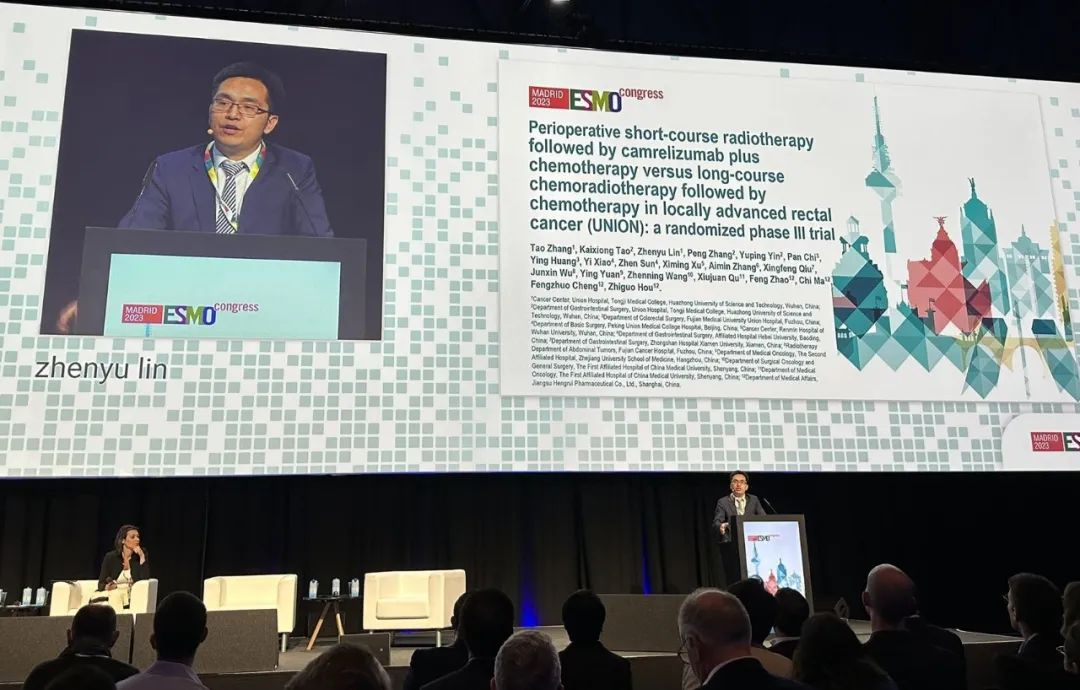 10月21日,PA视讯医药创新药卡瑞利珠单抗的一项研究“新辅助短程放疗序贯卡瑞利珠单抗联合化疗对比长程放化疗序贯化疗治疗局部晚期直肠癌”随机对照Ⅲ期试验(UNION)亮相2023 ESMO大会优选口头报告现场。该研究由华中科技大学同济医学院附属协和医院张涛教授、陶凯雄教授担任主要研究者,华中科技大学同济医学院附属协和医院林振宇教授在大会现场报告了该重磅研究的结果1。此项研究是全球首个评估短程放疗序贯免疫治疗联合化疗治疗局部晚期直肠癌的Ⅲ期研究,已达到主要终点病理完全缓解(pCR),有望为直肠癌患者的治疗提供新策略。