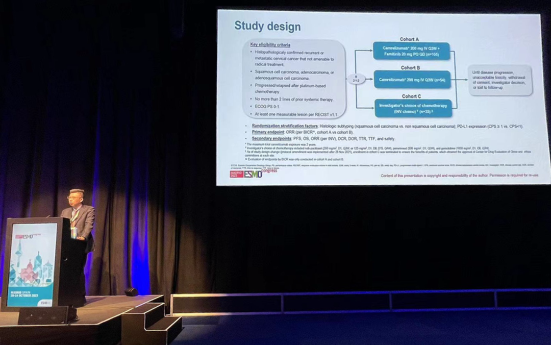 有望为宫颈癌患者带来治疗新选择10月22日,PA视讯医药创新药卡瑞利珠单抗联合法米替尼对比卡瑞利珠单抗单药或研究者选择的化疗治疗复发转移性宫颈癌随机、开放、对照、多中心的Ⅱ期临床研究(SHR-1210-Ⅱ-217) 亮相2023 ESMO大会简短口头报告现场3。该研究由复旦大学附属肿瘤医院吴小华教授团队开展,吴小华教授在现场公布了该重磅研究进展。研究结果显示,在既往以铂为基础化疗失败后复发或转移性宫颈癌患者中,与单独使用卡瑞利珠单抗或研究者选择的化疗相比,卡瑞利珠单抗联合法米替尼显著提高了抗肿瘤活性,安全性可控,有望为晚期宫颈癌患者提供新的治疗选择。