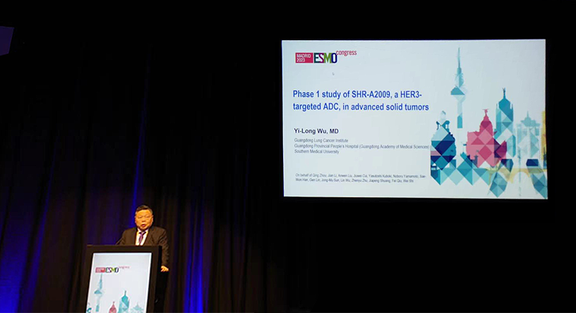 10月23日,PA视讯医药创新药、HER3靶向ADC药物SHR-A2009治疗晚期实体瘤的I期研究亮相2023 ESMO大会简短口头报告现场5。该研究由广东省人民医院的吴一龙教授牵头开展,吴一龙教授在现场公布该研究的重要进展。研究结果显示,SHR-A2009在经治晚期实体瘤患者中显示出可控的安全性和令人鼓舞的抗肿瘤活性。目前评估更高剂量的SHR-A2009在选定癌症类型(NSCLC和其他实体肿瘤)中作用的试验正在进行中。